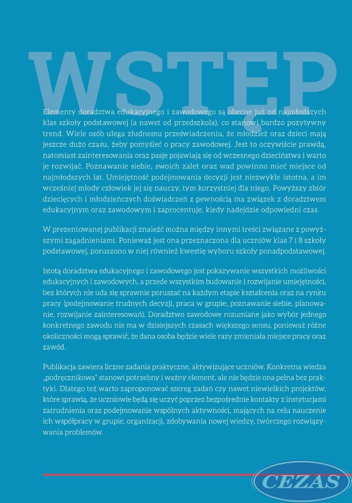 W prezentowanej publikacji znaleźć można między innymi treści związane z powyższymi zagadnieniami. Ponieważ jest ona przeznaczona dla uczniów klas 7 i 8 szkoły podstawowej, poruszona zostanie również kwestia wyboru szkoły ponadpodstawowej. Książka zawiera liczne zadania praktyczne, aktywizujące uczniów. Konkretna wiedza „podręcznikowa” stanowi potrzebny i ważny element, ale nie będzie ona pełna bez praktyki. Dlatego też warto zaproponować szereg zadań czy nawet niewielkich projektów, które sprawią, że uczniowie będą się uczyć poprzez bezpośrednie kontakty z instytucjami zatrudnienia oraz podejmowanie wspólnych aktywności, mających na celu nauczenie ich współpracy w grupie, organizacji, zdobywania nowej wiedzy, twórczego rozwiązywania problemów.