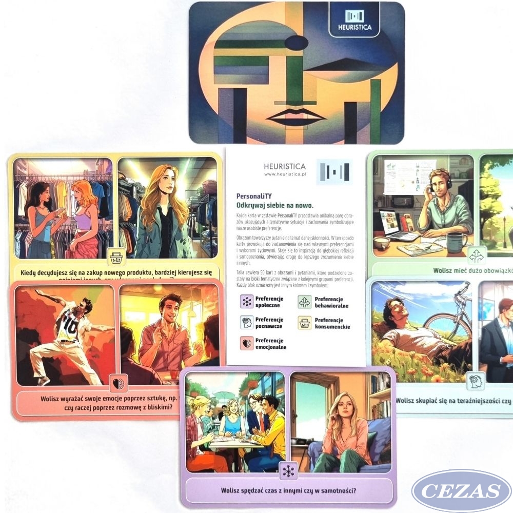 Każda karta w zestawie PersonaliTY przedstawia unikalną parę obrazów ukazujących alternatywne sytuacje i zachowania symbolizujące nasze osobiste preferencje.